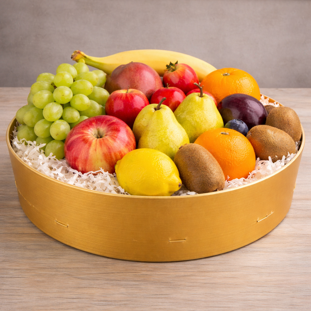 Een verse, met zorg samengestelde fruitschaal vol seizoensfruit. Perfect als gezond cadeau, voor op tafel of om iemand mee te verrassen.